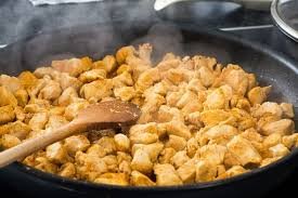 - Az olajat felforrósítjuk egy nagyobb serpenyőben, rádobjuk a fokhagymát és 0,5-1 perc múlva a húst is (A fokhagymára vigyázni kell, mert hamar megkeseredik. Ha az edény fölé hajolva érezzük az illatát, akkor mehet is bele a többi hozzávaló).