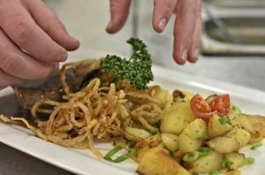 Amíg a hús elkészül, készítsünk hozzá ropogós sült hagymát (a hagymát felszeleteljük, alaposan megforgatjuk lisztben és forró olajban kisütjük) és petrezselymes burgonyát.