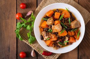 - Amikor a hús majdnem puha, rátesszük a sütőtököt, alaposan összekeverjük, és ráöntjük az alaplevet. Amikor felforrt, hozzákeverjük a babot és a citromlevet is, ha szükséges utánaízesítjük és kb. 10 perc alatt készre főzzük. Óvatosan keverjük, hogy a bab ne törjön szét.